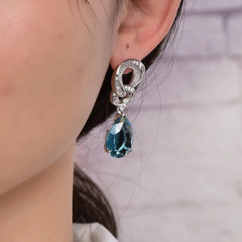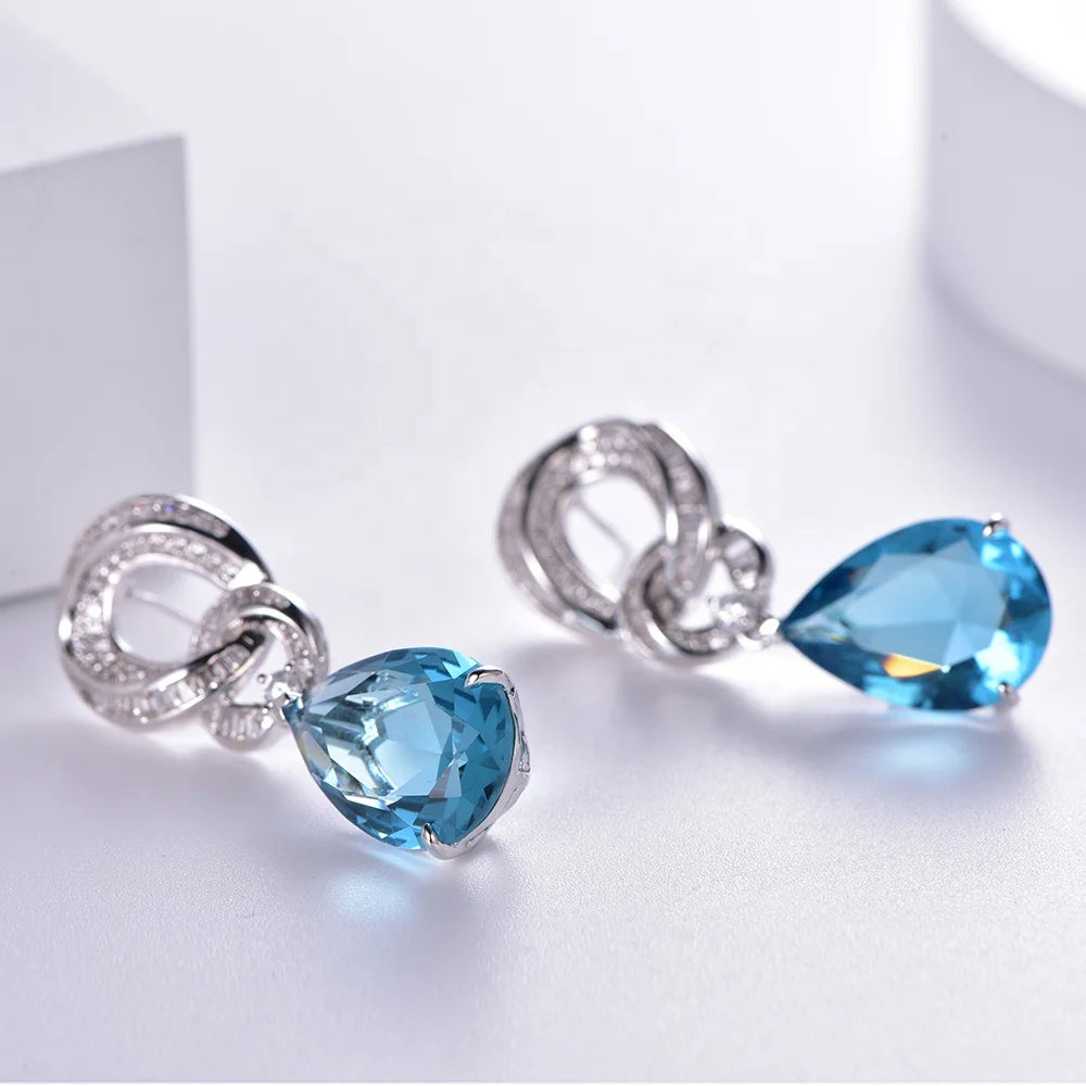 925 Sterling Silver Earrings 5A CZ Aquamarine Mossinate Blue Topaz Diamond Earrings Dangle Drop Earrings