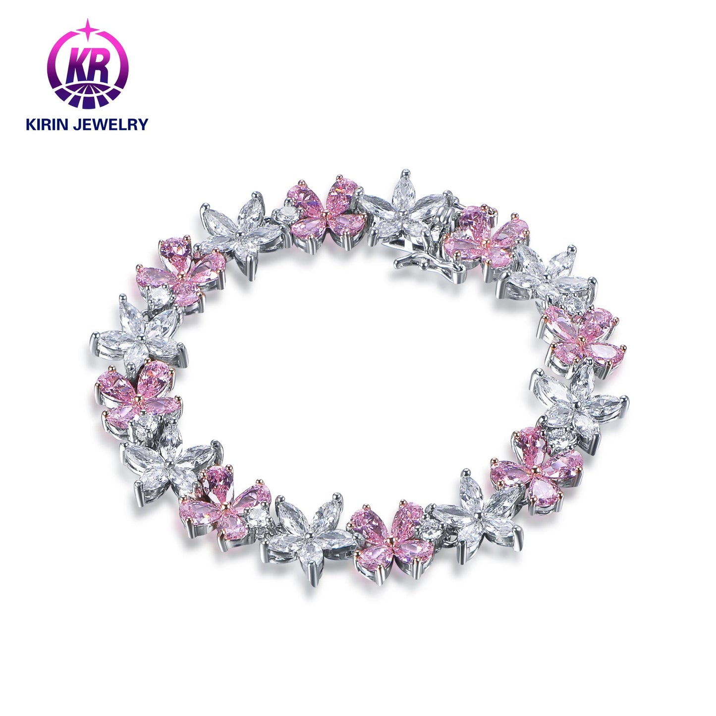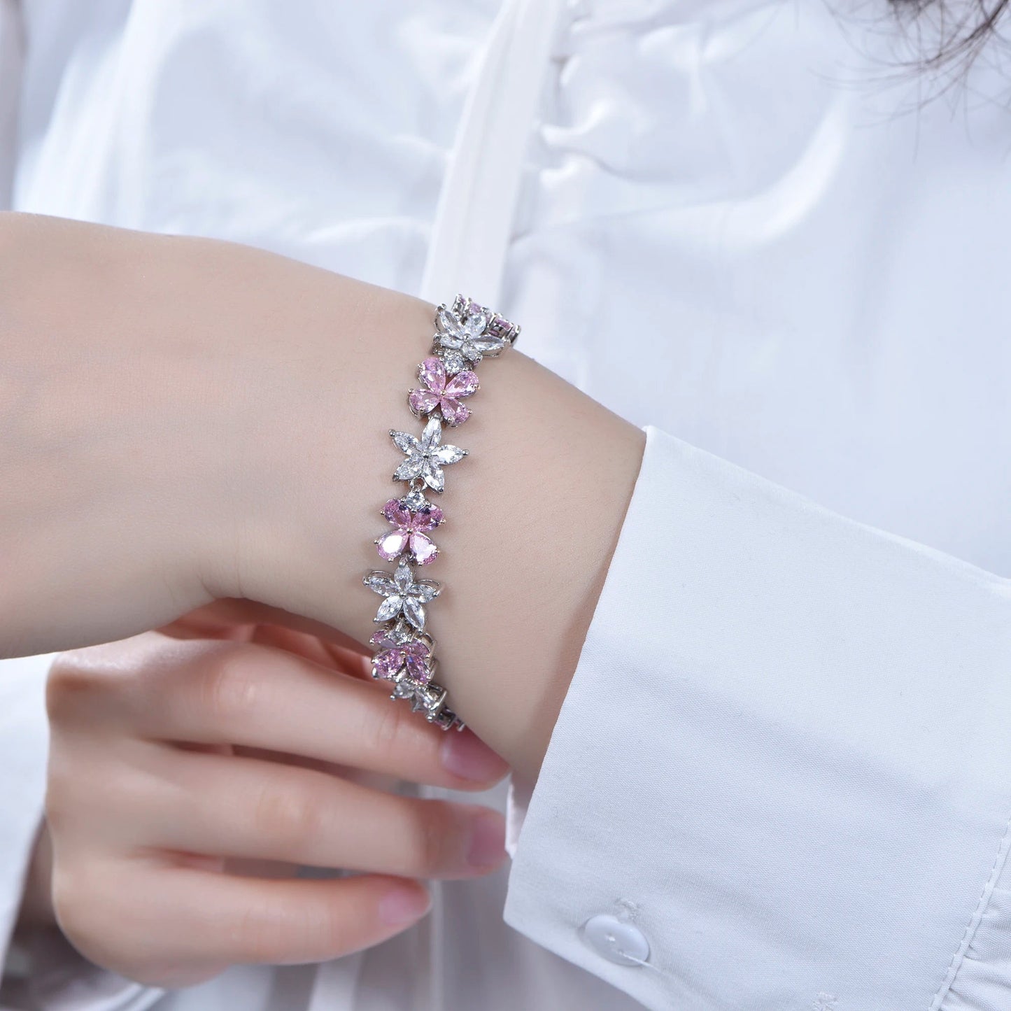 Wholesale 925 Silver Cubic Zircon White & Pink Flower Tennis Bracelet