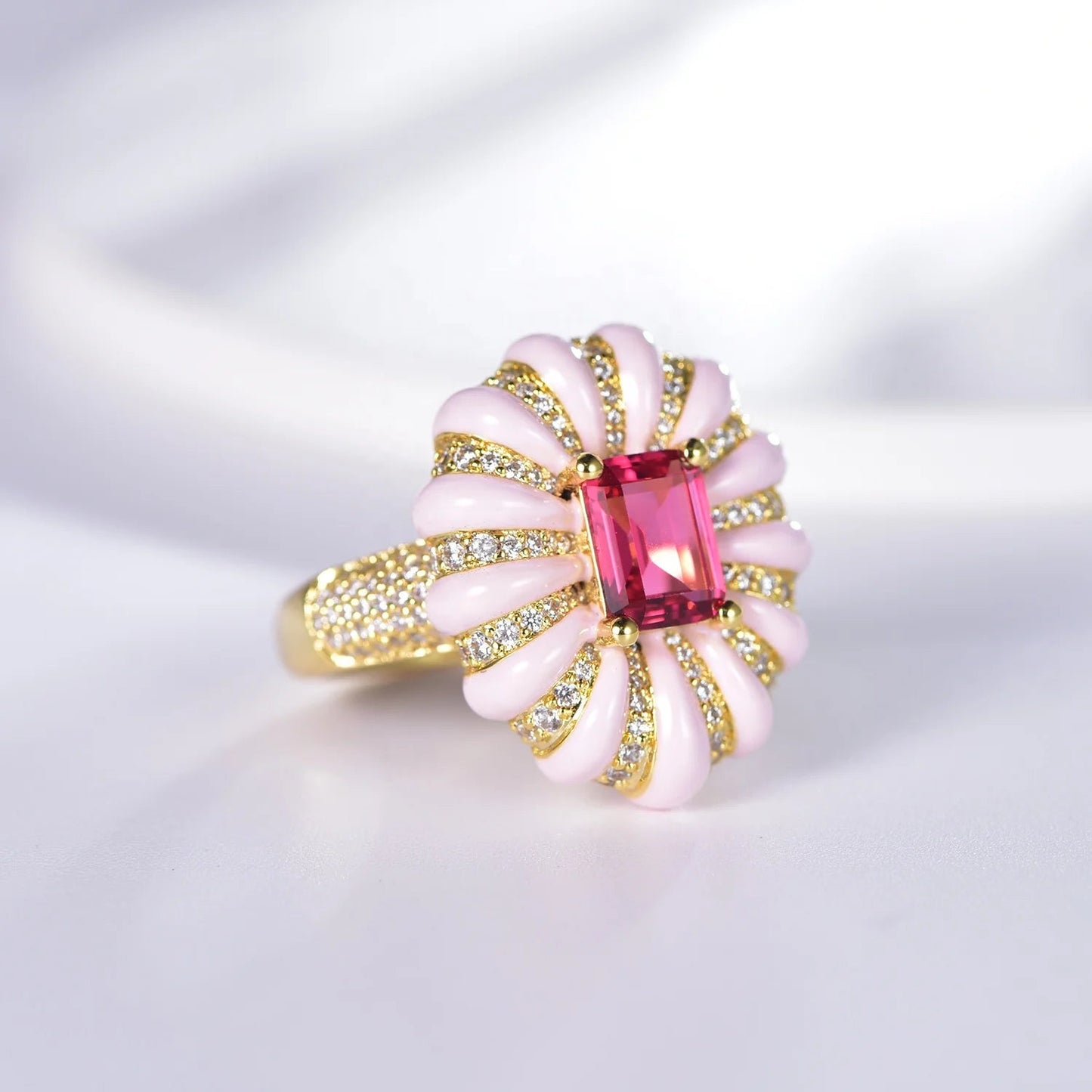 925 Silver Gold Plated flower shape zircon ring medieval style light luxury emerald cut diamond ring