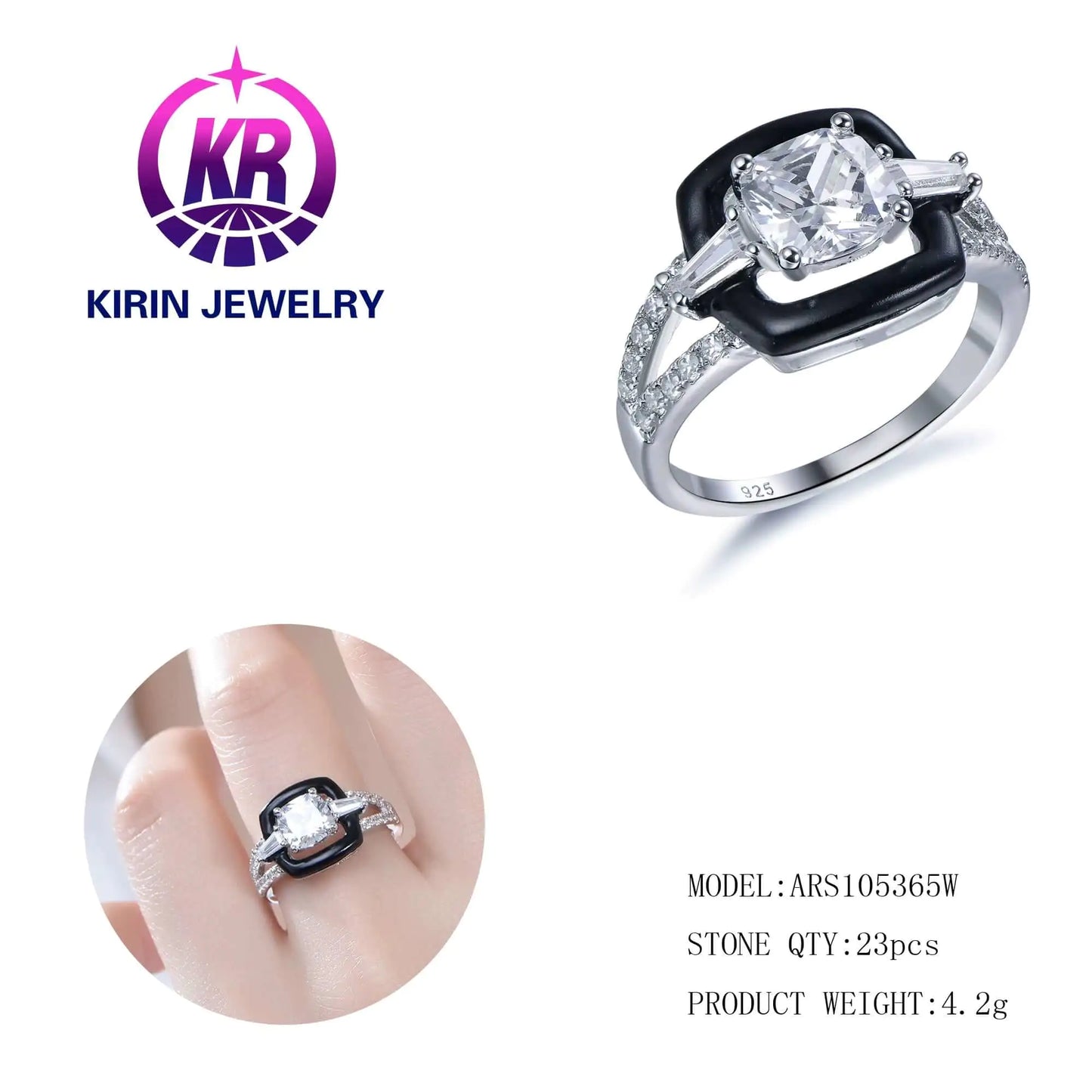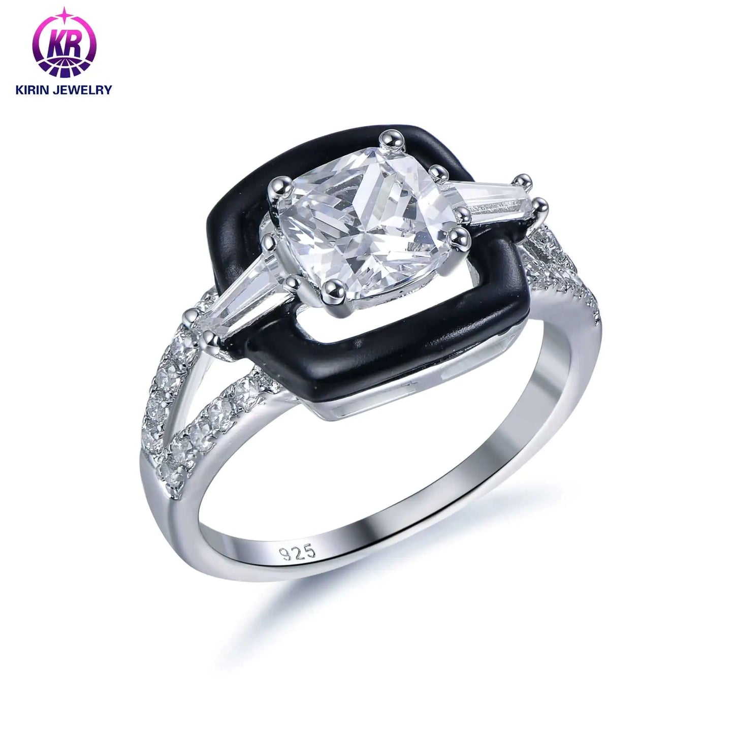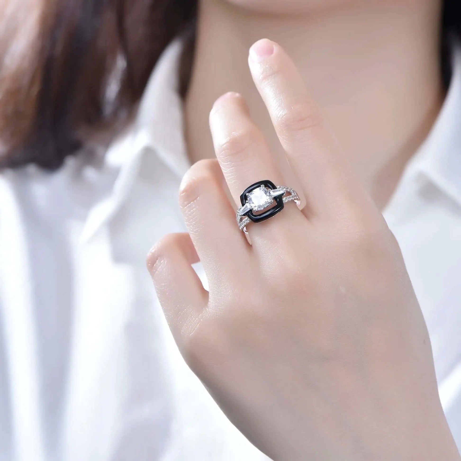 Wholesale Silver CZ Black Enamel Split Shank Square Geometric Engagement Rings